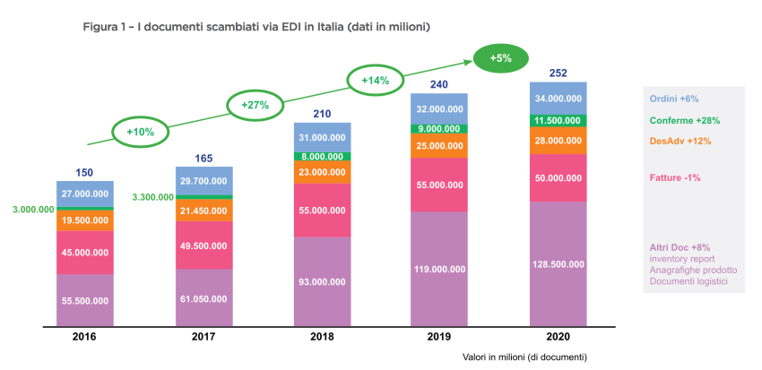 Il dato delle imprese che adottano l’EDI in Italia è stabile rispetto al pre-pandemia - 19 mila nel 2020, scambiando 252 milioni di documenti (+5% vs 2019)[1] - ed è legato prevalentemente al fatto che molti operatori, obbligati alla fatturazione elettronica, hanno scelto di utilizzare solo il flusso per il sistema d’interscambio (SdI, gestito dall'Agenzia delle Entrate) senza sovrapposizioni con il flusso EDI. Le fatture, infatti, pur continuando a rimanere il primo documento scambiato, calano a 50 milioni di unità (-1% rispetto al 2019), dopo due anni in cui si sono attestate sui 55 milioni. In crescita sono invece tutti gli altri documenti: ordini +6%, conferme d’ordine +28%, DESADV (avviso di spedizione) +12%, altri documenti (come inventory report, anagrafiche di prodotto, documenti logistici) +8%.