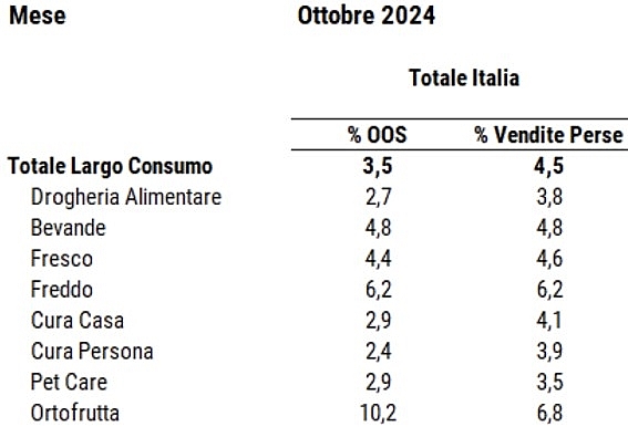 Secondo l’ultima rilevazione del Barometro Osa (Optimal shelf availability), l'iniziativa di GS1 Italy in ambito ECR fatta in collaborazione con Circana, che monitora mensilmente l'indice di out-of-stock e le vendite perse nel largo consumo confezionato, a ottobre il tasso di OOS è stato pari al 3,5%, in aumento di +0,7 punti rispetto a un anno fa ma identico al mese precedente. I livelli di OOS peggiorano in tutti i reparti: i più colpiti sono ortofrutta (+2,4 punti), freddo (+1,7) e bevande (+1,5). Peggiora anche la percentuale di vendite perse che si fissa al 4,5%, in aumento di +0,2 punti rispetto a ottobre 2023, a causa soprattutto dei reparti freddo (+2,0 punti), ortofrutta (+0,8) e bevande (+0,7).