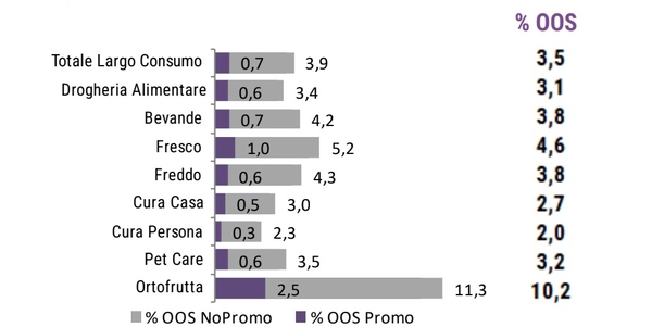Tra i supermercati grandi stabile al 3,5% il tasso di OOS, con l'andamento migliore nel pet care (-0,3) e quello peggiore nel cura persona (+0,3). I supermercati piccoli registrano un tasso di OOS stabile al 3,0%. Migliora il fresco (-0,3 punti), peggiora il reparto dell’ortofrutta (+0,1). Per quanto riguarda la percentuale di vendite perse il dato relativo a ipermercati e supermercati piccoli migliora di -0,1punti mentre peggiorano di +0,2 punti i supermercati grandi.