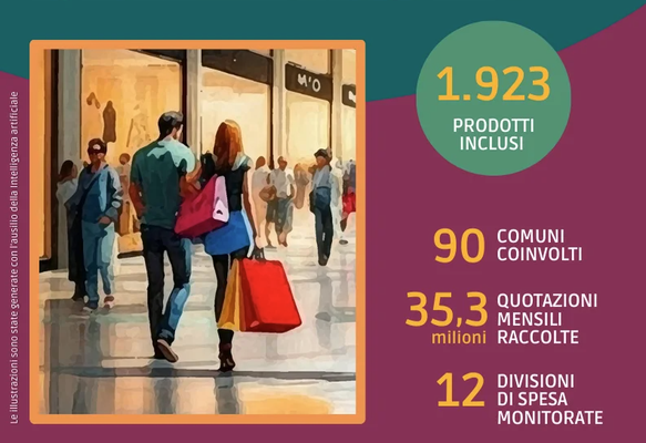 Per elaborare il paniere 2025 l'Istat analizza ogni mese circa 35 milioni di quotazioni di prezzo – di fonte scanner data e provenienti dalla grande distribuzione organizzata (GDO) – suddivise in 12 divisioni di spesa monitorate attraverso un campione di circa 4.250 punti vendita, appartenenti a 19 grandi gruppi della distribuzione al dettaglio, rappresentativi dell’intero territorio nazionale. A queste se ne aggiungono ulteriori 388 mila raccolte sul territorio dagli Uffici comunali di statistica (UCS), mentre circa 237 mila sono radunate dall’Istat (direttamente o tramite fornitori di dati) e circa 214 mila sono rappresentate dalle quotazioni provenienti dalla base dati dei prezzi dei carburanti del Ministero delle Imprese e del Made in Italy.