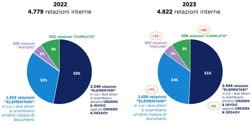 Nello specifico, le relazioni mature, ossia quelle che prevedono lo scambio dei tre documenti base – la “triade” principale del ciclo dell’ordine, cioè ordine e avviso di spedizione e fattura (ORDERS & DESADV & INVOIC) –, registrano una lieve crescita di +1%, mentre le relazioni più complete, che scambiano, cioè, almeno un quarto documento aggiuntivo, sono aumentate di +9%, passando da 421 nel 2022 a 458 nel 2023. Di queste, 425 (il 93% della categoria) include l’aggiunta di un solo documento, mentre in 31 casi vengono aggiunti due documenti. In soli due casi, invece, ne vengono aggiunti tre, raggiungendo così lo scambio complessivo di sei diverse tipologie di messaggi.