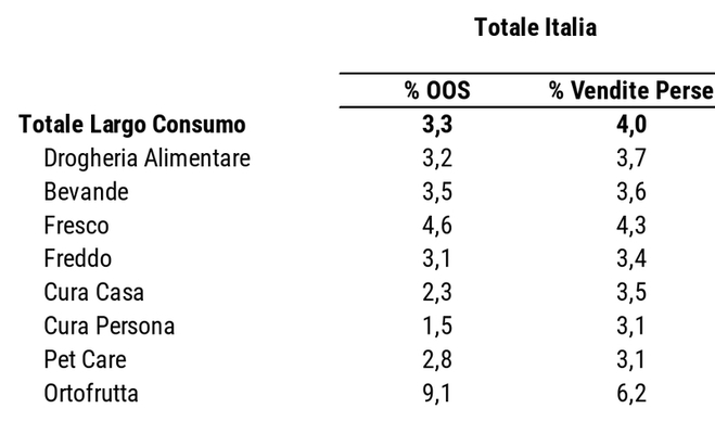 a gennaio 2025 la percentuale di OOS media è stata pari al 3,3% in condizioni regolari, ma si abbassa drasticamente in presenza di promozioni. Per il largo consumo confezionato la probabilità di trovare un prodotto fuori stock in promozione si riduce fino allo 0,7%. Tendenza uguale in tutti i reparti, dal valore più basso, registrato dal cura persona (0,2%) fino a quello più alto, raggiunto dal reparto ortofrutta (2,7%). Confrontando l'indice tra la percentuale di vendite perse e quella di OOS nelle due condizioni (promo e no promo), si rileva che le occasioni di out-of-stock in condizione promozionale sono economicamente più impattanti e pericolose per Industria e Distribuzione soprattutto per i reparti del cura casa e cura persona.