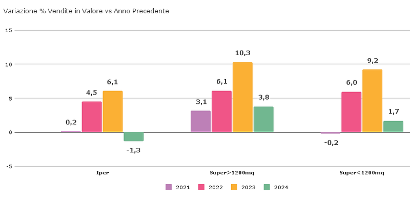 A livello di canale di vendita, le tendenze di sell-out, confermano i valori positivi registrati a totale mercato e anche il relativo rallentamento rispetto al 2023. Gli ipermercati si posizionano come il canale più in difficoltà nel sostenere il valore delle vendite (Vedi Figura 6)
