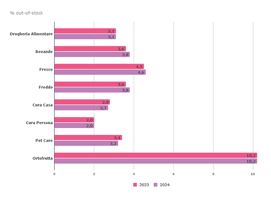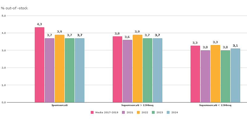In questo scenario, osservando l’indicatore di disponibilità di prodotto a scaffale, la lettura per canali evidenzia come nel 2024 quasi tutti i canali siano riusciti a mantenere invariata la % di out-of-stock. (Vedi Figura 7)