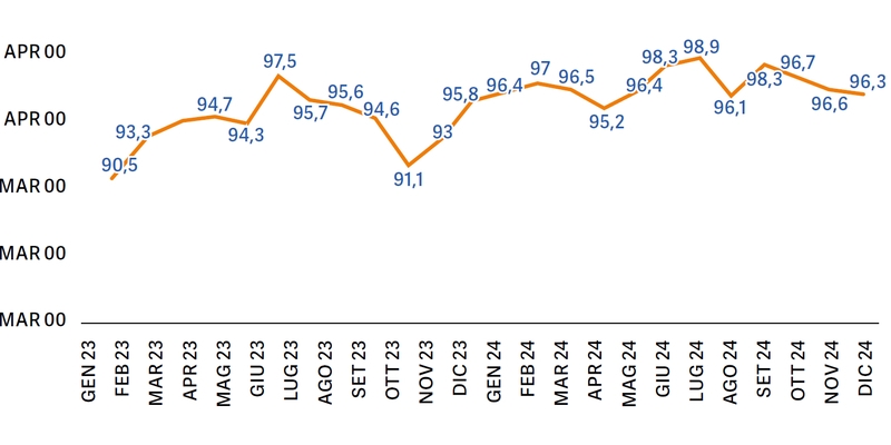 Il clima di fiducia dei consumatori del 2024 ha avuto un livello mediamente più elevato rispetto al 2023, raggiungendo una media pari a 97,0 rispetto al 94,2 dell'anno precedente. Va però tenuto conto dell’andamento in flessione degli ultimi mesi del 2024 dove l’indice di fiducia dei consumatori è diminuito per tre mesi di fila.