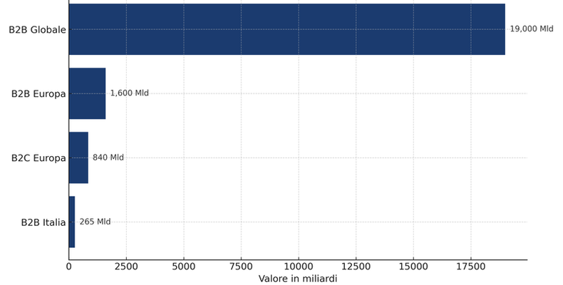 A livello globale, l’e-commerce B2B vale già oltre 19 mila miliardi di dollari e potrebbe arrivare a 50 mila entro il 2030. E se l’Europa pesa per il 57% del valore mondiale, l’Italia mostra un chiaro ritardo: secondo l’Osservatorio Digital B2B del Politecnico di Milano, il valore del comparto si attesta a 265 miliardi di euro, per le sole vendite di prodotto, servizi esclusi, pari al 21% del transato complessivo.