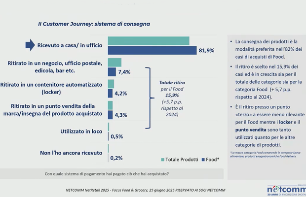 L’e-commerce food è stimato in crescita dell’8,5% nel 2025 contro il 6% delle altre categorie merceologiche vendute online. È anche l'unico settore in cui si osserva un differenziale di prezzo maggiore nel digitale rispetto all'acquisto fisico. Questa peculiarità è attribuibile al fatto che, nel settore alimentare, la prima leva d'acquisto non è il prezzo, ma la consuetudine con il marchio (citata dal 35% degli utenti), seguita dal servizio, in particolare quello di consegna (29,4%). Queste evidenze emergono durante il Netcomm Focus Food & Grocery.