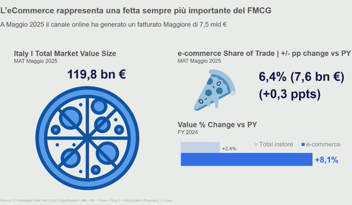 Allargando lo sguardo sull’andamento delle vendite del largo consumo (FMCG - Fast Moving Consumer Goods) sul canale digitale, Valeria Miccolis di Nielsen IQ spiega che nell’anno terminante a maggio 2025, in Italia il comparto ha generato un fatturato di 7,5 miliardi di euro (+0,3% sull’anno precedente), il 6,4% di quota di mercato a valore rispetto a un giro d’affari complessivo di 119,8 miliardi di euro, con una crescente preferenza dei portali specializzati di categoria a discapito dei brick & mortar (attività commerciali che hanno una presenza fisica) e pure player (azienda che opera esclusivamente online) generalisti.