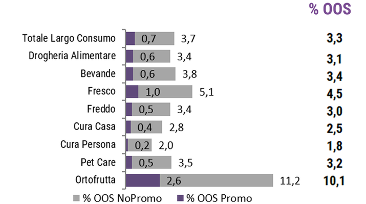 Nel primo semestre 2025 la percentuale di OOS media è stata al 3,3% in condizioni regolari ma si abbassa drasticamente in presenza di promozioni. Per il largo consumo confezionato la probabilità di trovare un prodotto fuori stock in promozione si riduce fino allo 0,7%. Tendenza uguale in tutti i reparti, dal valore più basso registrato dal cura persona (0,2%) fino a quello più alto raggiunto dall'ortofrutta (2,6%). Confrontando l'indice tra percentuale di vendite perse e percentuale di out-of-stock nelle due condizioni (promo e no promo), si deduce che le occasioni di OOS in condizione promozionale sono economicamente più impattanti e più pericolose per Industria e Distribuzione, in particolare per il cura casa e il cura persona.