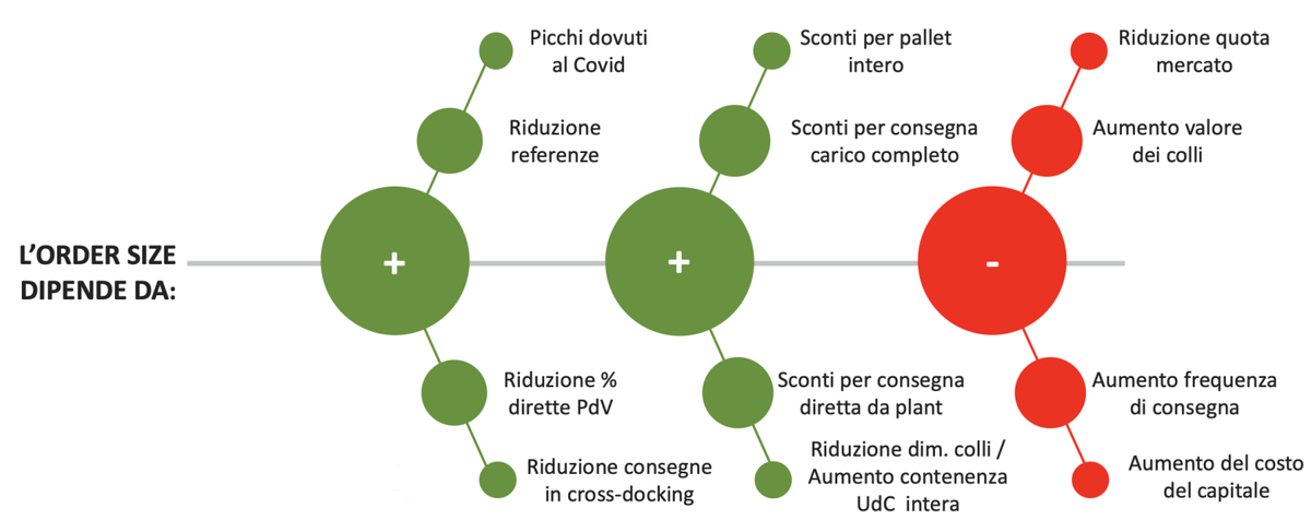 L’aumento dell’order size medio ha un impatto positivo sull’efficienza del trasporto e sul lead time ordine-consegna offerto dai fornitori alla GDO. Con ordini di dimensioni più grandi si riducono infatti i passaggi intermedi nelle spedizioni da stabilimento a Ce.Di., ma anche gli errori in fase di allestimento.