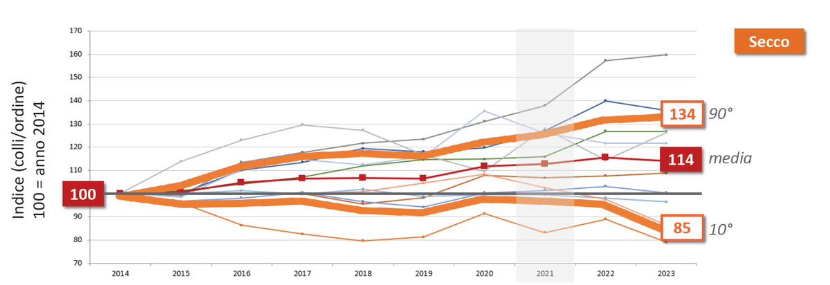 Dalle interviste fatte ad alcune delle principali aziende produttrici è infatti emerso che, tra il 2014 e il 2023, la dimensione media dell’ordine nella categoria merceologica “secco” è cresciuta del 14%. Questo incremento è confermato anche dalla maggiore incidenza delle unità di carico (UdC) intere mono-referenza inviate dai fornitori verso i centri distributivi (Ce.Di.) della Grande Distribuzione Organizzata (GDO), passata dal 76% al 79% tra il 2018 e il 2023, con picchi fino al 95% nel caso dei prodotti beverage.