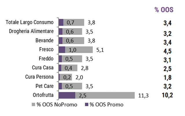 Per il largo consumo confezionato la probabilità di trovare un prodotto fuori stock in promozione si riduce fino allo 0,7%, con il valore più basso registrato dal cura persona (0,2%) e il più alto dall'ortofrutta (2,5%). Tuttavia, confrontando l’indice tra percentuale di vendite perse e percentuale di out-of-stock nelle due condizioni (promo e no promo) si rileva che le occasioni di OOS in condizione promozionale sono economicamente più impattanti e più pericolose per Industria e Distribuzione, in particolare per i reparti del cura casa e cura persona.