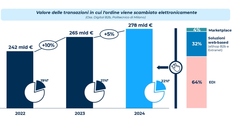 Secondo i dati dell’Osservatorio B2B Digital Commerce & Experience della School of Management del Politecnico di Milano, presentati nel convegno “B2B Digital Commerce & Experience: connettere dati, costruire relazioni”, il valore delle transazioni digitali nelle filiere di prodotto ha raggiunto nel 2024 i 278 miliardi di euro, in aumento del 5% rispetto al 2023.