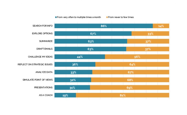 Lo scorso luglio, l’Osservatorio Platform Thinking Hub ha lanciato una survey per indagare il livello di adozione delle GenAI e i principali utilizzi nelle aziende. Le risposte raccolte da 419 manager di 162 imprese in Italia indicano che la quasi totalità degli intervistati e delle intervistate usa oramai abitualmente questa tecnologia nel proprio lavoro. Oltre il 57% anche più volte al giorno. L’utilizzo però è ancora limitato ad attività “banali” come la ricerca di informazioni (86%), il riassunto di testi (63%) o la scrittura di e-mail (63%).