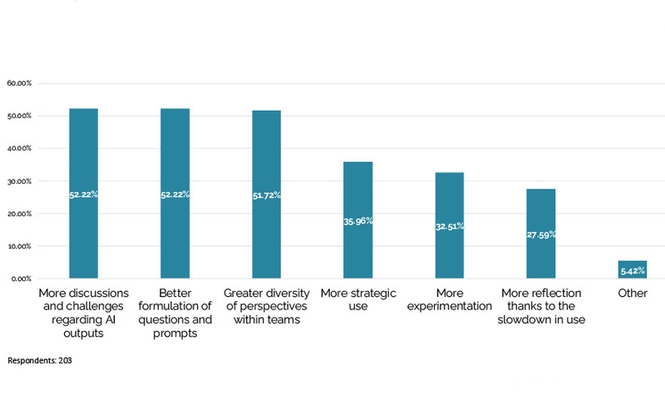 Solo il 12% dal campione osservato utilizza la tecnologia a livelli avanzati sia come co-pilot che come co-thinking. La maggioranza è ancora a uno stadio iniziale per entrambi gli utilizzi. «Per alzare la percentuale» ha detto Rosani «bisogna imparare usare prompt dialogici accurati: offrire all’IA una visione quanto più chiara possibile del contesto, dialogare in maniera attiva con la macchina, sfidandola a non compiacerci nell’output».