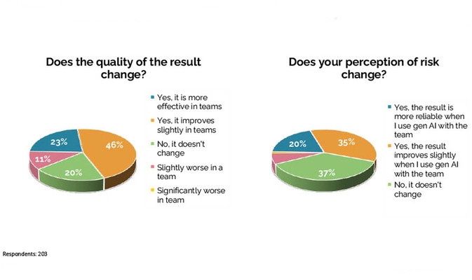 L’Osservatorio Platform Thinking HUB ha anche indagato le tipologie e la frequenza di utilizzo della GenAI nelle dinamiche collettive. Ne è emerso che solo occasionalmente l’IA viene utilizzata all’interno di un team strutturato. Tuttavia, chi ha provato a farlo ne ha rilevato benefici in termini di qualità ed efficacia dei risultati, ma anche di ridotta percezione dei rischi normalmente connessi all’uso dell’IA, quali conformità degli output o un’interazione eccessivamente accomodante da parte della macchina.