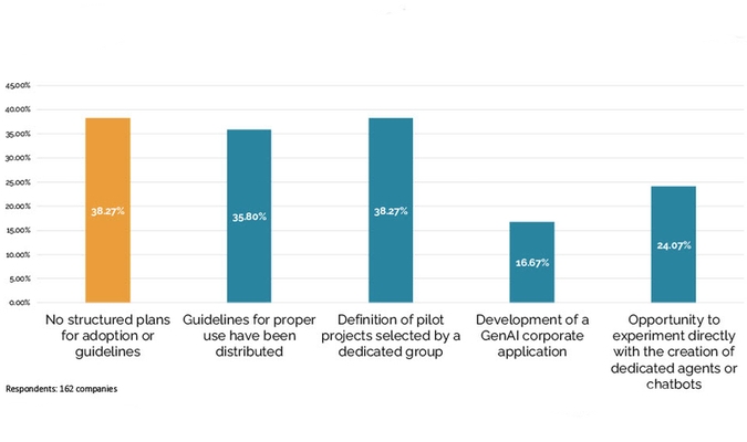 La survey si è anche concentrata sul cambiamento sistemico che può essere innescato dall’utilizzo di GenAI in processi complessi interni ed esterni all’azienda. Agli intervistati e alle intervistate è stato chiesto di indicare il livello di adozione di questa tecnologia nella propria organizzazione. A fronte di un abbondante 38% delle aziende che dimostra un atteggiamento passivo e attendista, la maggior parte sta facendo qualcosa, ma per lo più con approccio top-down. Poco meno del 17% delle aziende sta usando la GenAI in maniera strutturata.