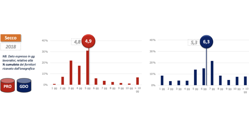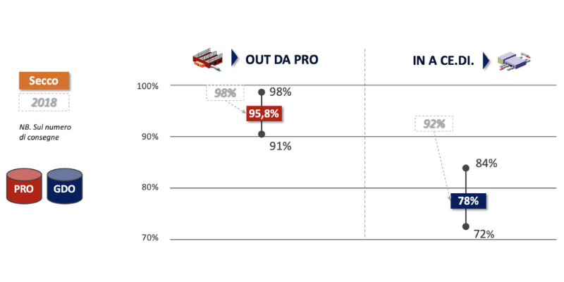 La cosa più interessante emersa in questo caso è l’allungamento del lead time per il secco dovuto molto probabilmente a diverse logiche di allocazione delle scorse e più frequenti tentativi dei PRO di evadere gli ordini direttamente dagli stabilimenti, oltre che alla ricerca di una maggiore efficienza nel trasporto.