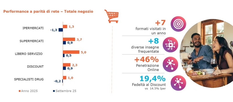 La frammentazione della spesa porta anche a un contesto di enorme fluidità e concorrenza tra insegne (8) e formati (7) visitati in un anno dal cliente per controllare al meglio le spese e orientarle sempre più all'essenziale. Si consolida sempre più il discount come canale alternativo al supermercato, con il 19,4% di fedeltà in crescita (contro il 14,5% degli ipermercati, per esempio). Sempre bene la marca privata (30,3% dei volumi) e in costante crescita l'online che ha raggiunto ormai il 46% della popolazione: almeno una volta all'anno ogni famiglia italiana fa un acquisto online legato al largo consumo confezionato. Questi nuovi strumenti aprono scenari di omnicanalità, dove il successo di un'insegna o di un formato dipende dalla capacità di offrire un'esperienza di acquisto coerente e senza intoppi tra negozio fisico, e-commerce, app e servizi di click & collect, premiando chi riesce a soddisfare i bisogni dei clienti in modo rapido e personalizzato in ogni punto di contatto.